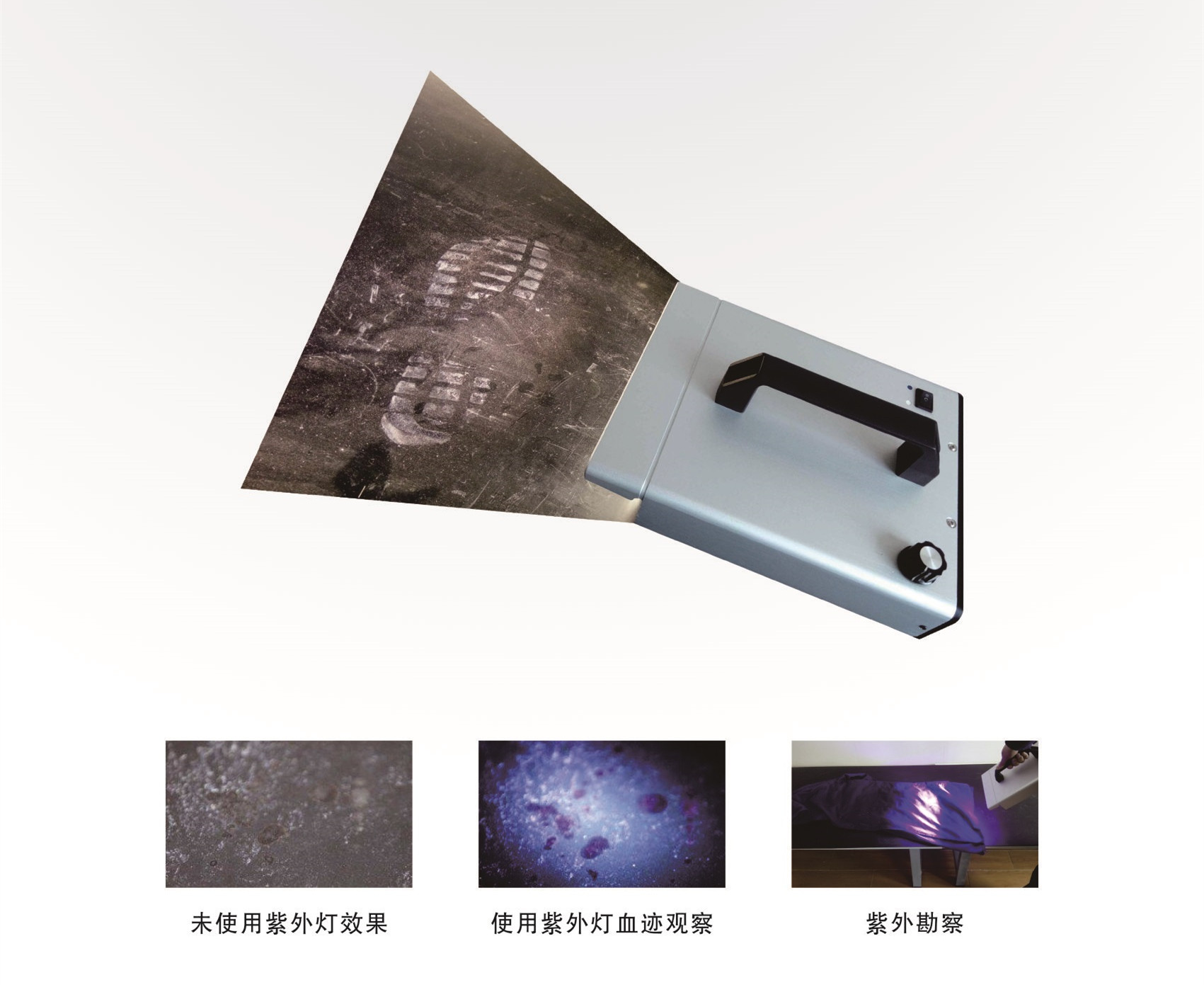 光源具有紫外勘察灯功能:既可以在实验室为物证检验提供紫外光照明,也可以在现场搜索物证。精斑、阴道分泌物、尿液、唾液、痰液等体液干涸后在紫外光照射下会产生荧光;许多矿物油、炸药、农药、纤维、洗涤剂等化学品在紫外光照射下都会产生荧光。荧光的强弱依赖于入射紫外光的强弱,许多物质(如干涸的尿液、唾液、痰液等)在弱紫外光的照射下呈现的荧光效果与白光环境下有很大不同,现有的多波段光源普遍难以达到相同的搜索效果。 技术指标: