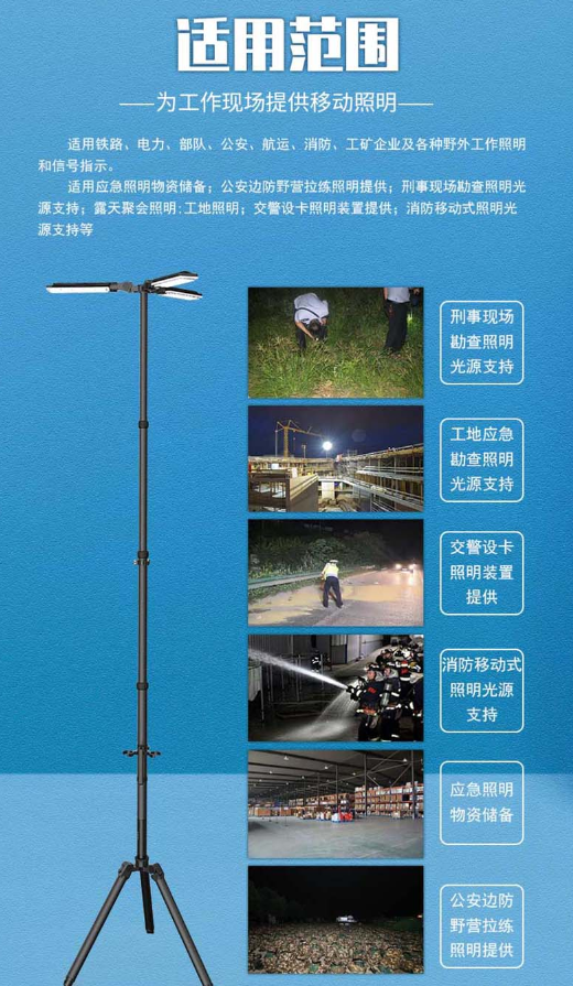 外观:设备采用隐蔽布线设计,看不到裸露电线;主要由灯头、伸缩杆和脚部支架组成,配备提手,方便携带